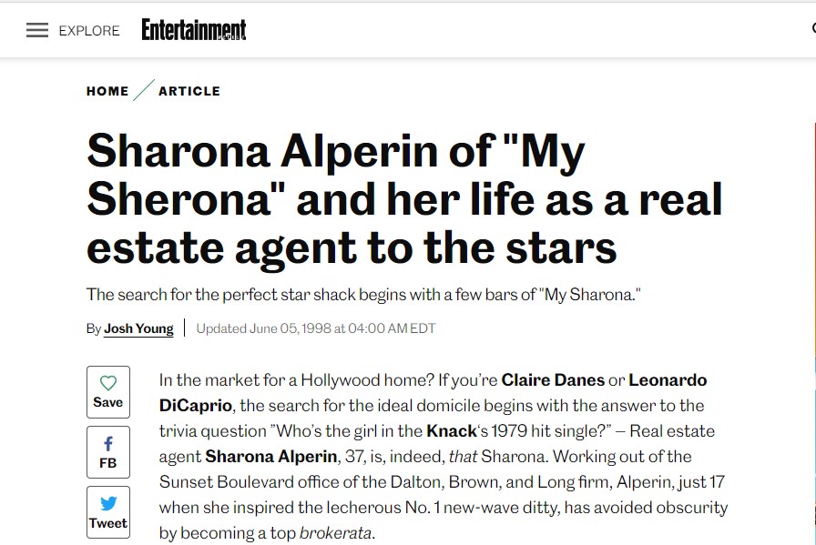In the market for a Hollywood home? If you’re Claire Danes or Leonardo DiCaprio, the search for the ideal domicile begins with the answer to the trivia question ”Who’s the girl in the Knack‘s 1979 hit single?” — Real estate agent Sharona Alperin, 37, is, indeed, that Sharona. Working out of the Sunset Boulevard office of the Dalton, Brown, and Long firm, Alperin, just 17 when she inspired the lecherous No. 1 new-wave ditty, has avoided obscurity by becoming a top brokerata.
